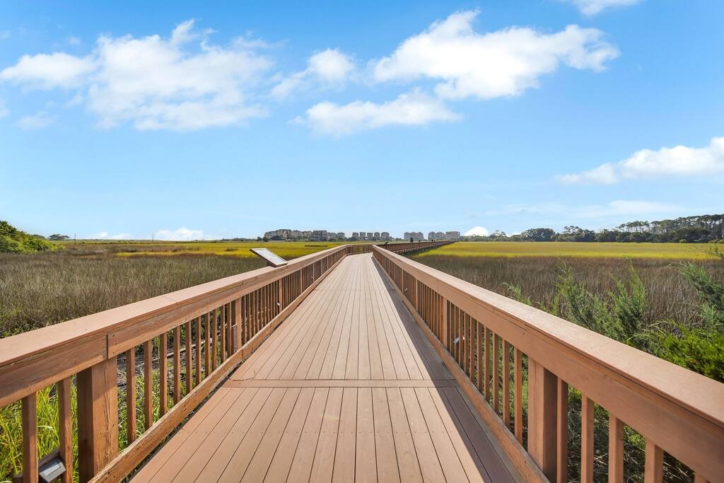 The resort itself is also packed with amenities: Three inviting pools. including an outdoor heated pool in Building #1 as well as a beautiful indoor recreation facility in Building #3 which includes a heated pool, kiddie pool and hot tub, walking track, a well-equipped gym, sauna & steam room, and even a small arcade! You can also enjoy delicious meals at the on-site deli or sip refreshing drinks at the poolside tiki bar and oceanfront Cabana. For those who love staying active, there are six lighted tennis and pickleball courts, a badminton court, as well as an oceanfront volleyball court. After a day of fun in the sun, you can grill up a feast at the designated area. A golf cart shuttle also runs April-September from the resort to the beach! If you have kids, they will love the 10 minute walk across the boardwalk with all the marine life! Beach essentials like beach chairs, tent, beach wagon, etc are provided in case you forget to bring some of your own.