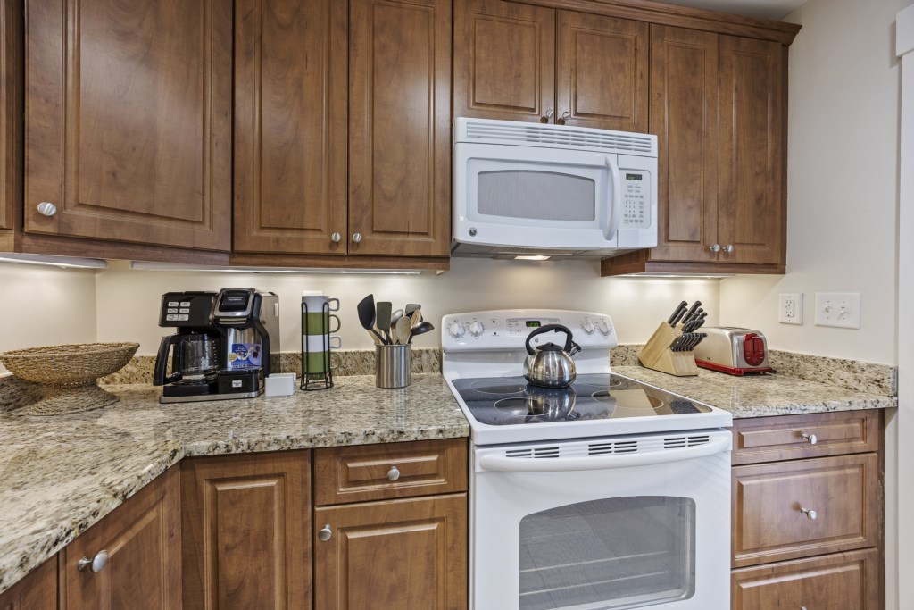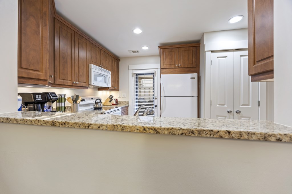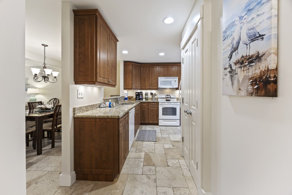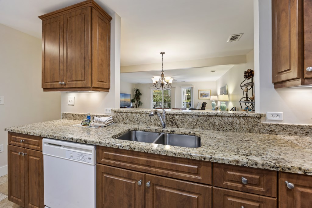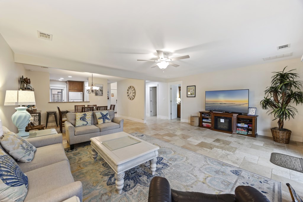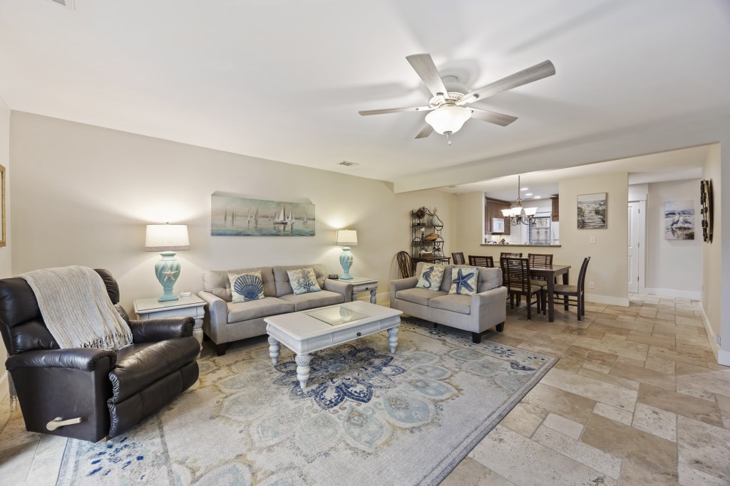 The living room is equipped with a sectional sofa, chairs, a coffee table, and side tables. A Roku Smart TV with streaming & cable channels is also provided, so feel free to kick back, relax, and watch your favorite shows and movies as you wind down for the evening! Connected to the living room is the sliding glass door that takes you out to the wide patio. You will have a gorgeous view of lakes from both sides! Feel free to use the grill to make some delicious meals as you catch up with friends and family.