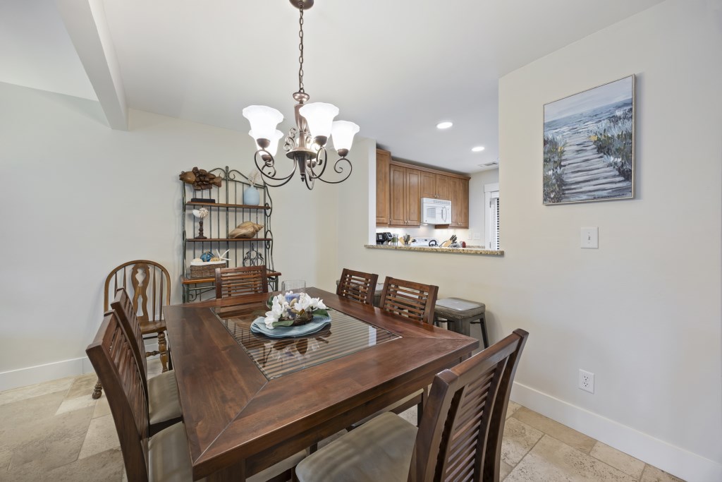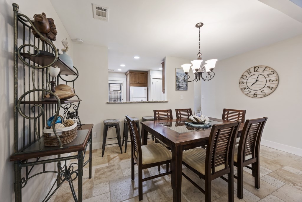 As you enter, you are greeted by the kitchen & dining room. All of the cooking & dining ware and utensils that you could need during your stay is provided; a full fridge & freezer, stove & oven, microwave, dishwasher, pots & pans, baking sheets, blender, toaster, a drip & pod coffee machine, etc. The dining table comfortably fits 6 guests and is perfect for all of the meals that you would like to make during your stay!
