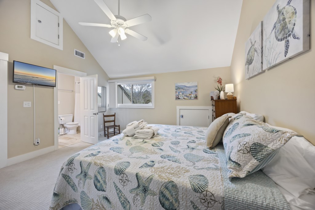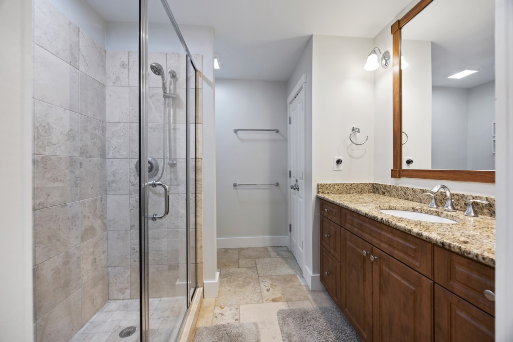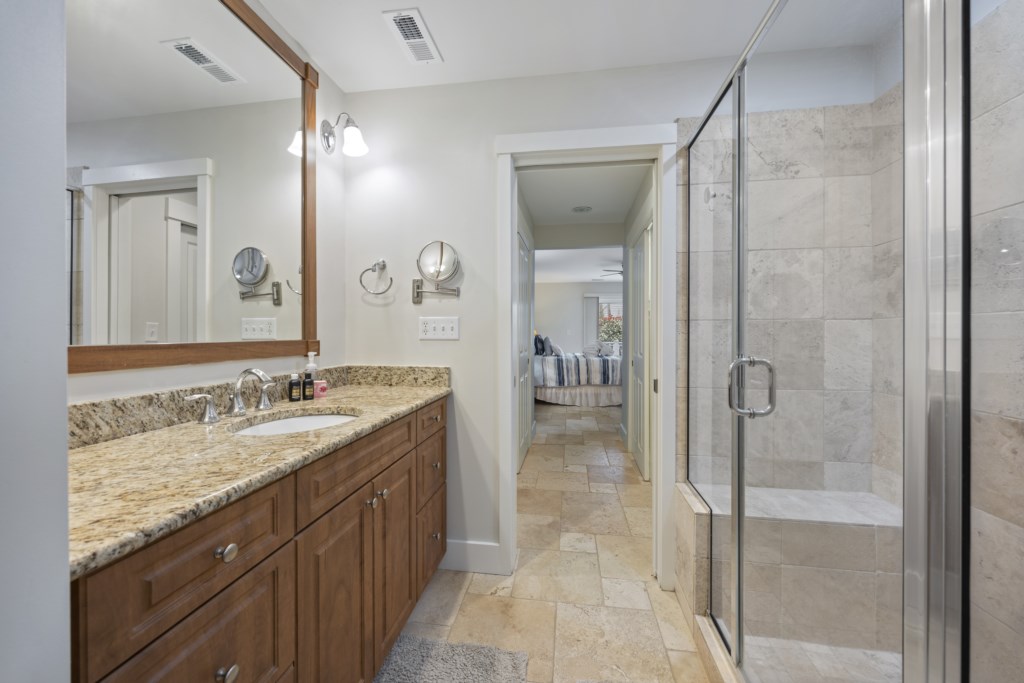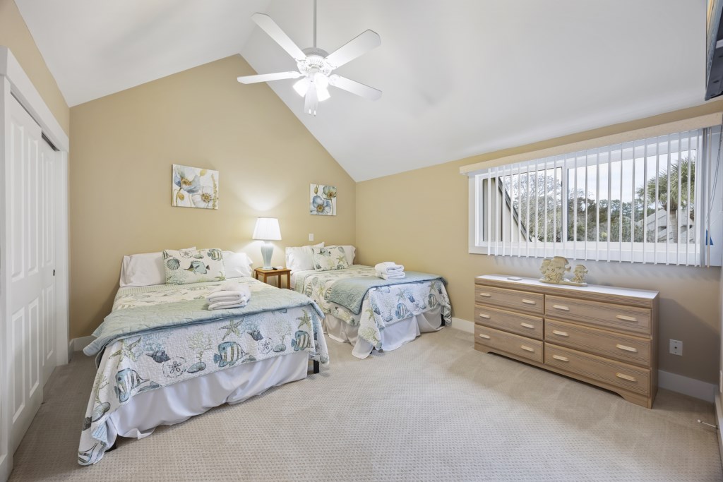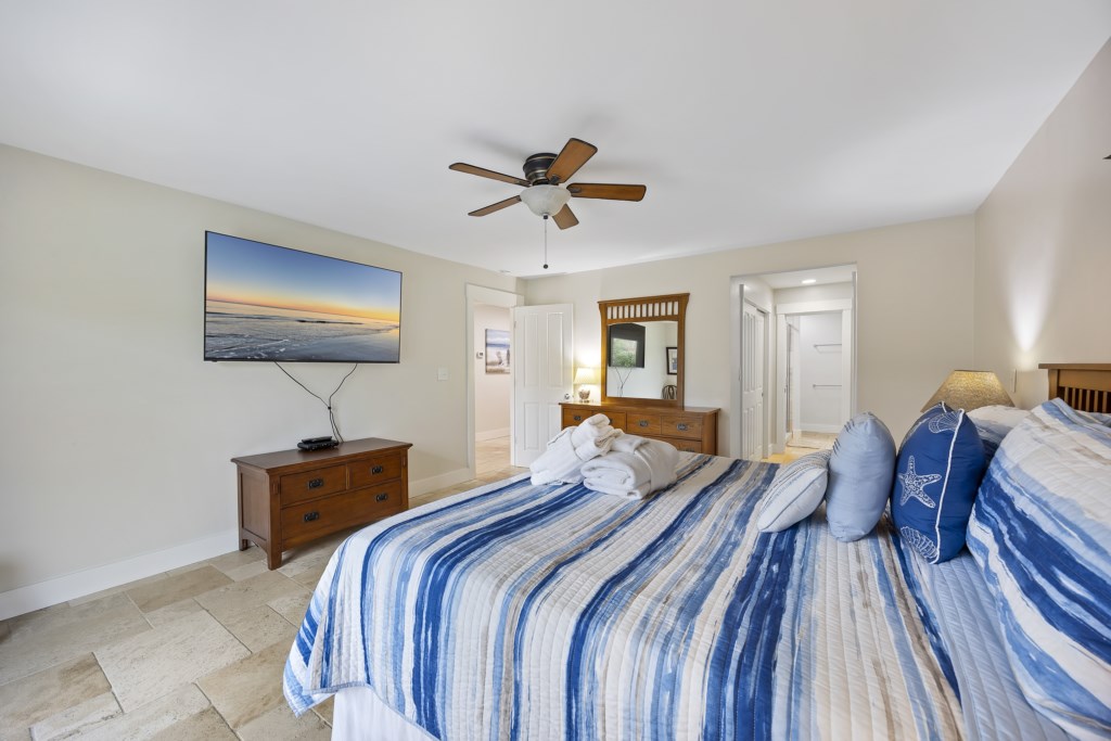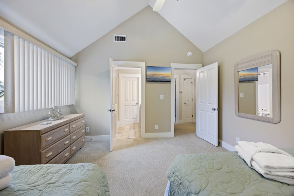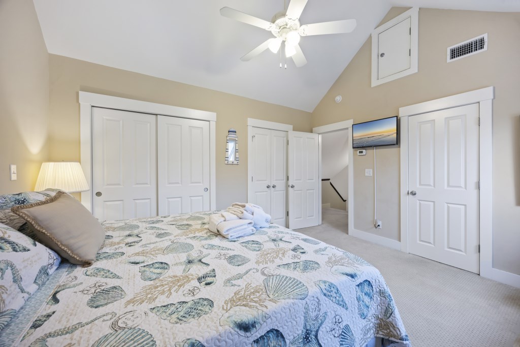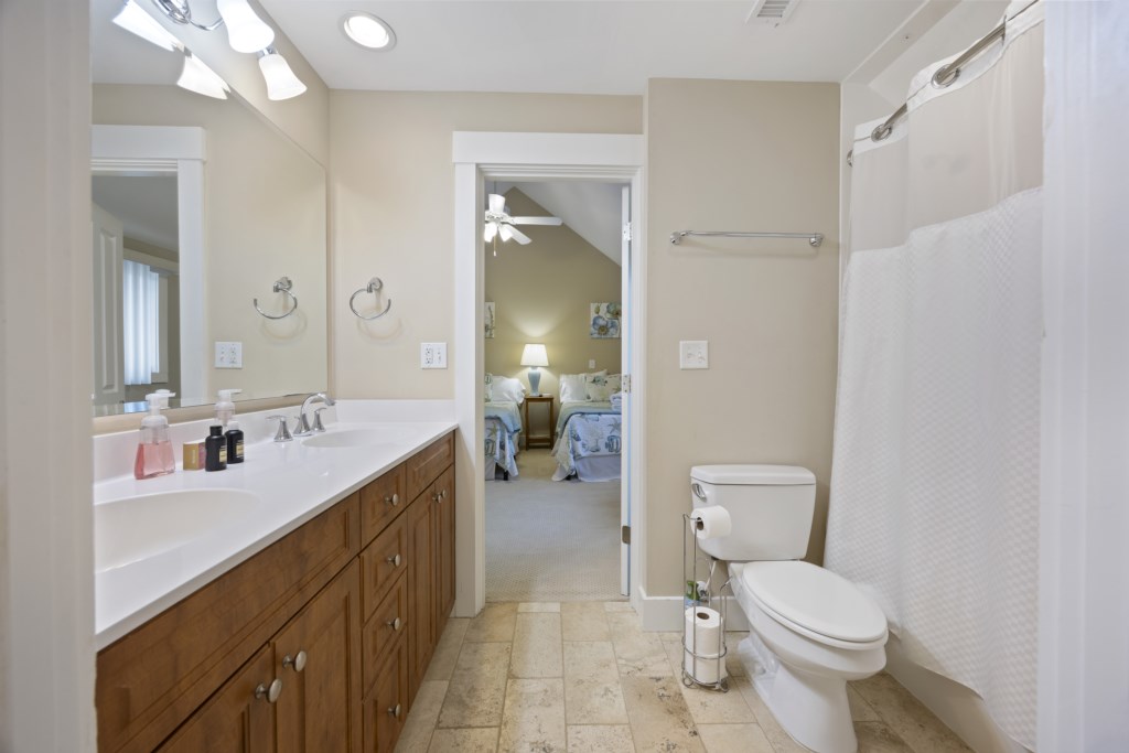 The main bedroom located on the first floor has ample room and provides you with a King bed. Two spacious closets are included for you to store all of your belongings out of sight, out of mind. The en-suite bathroom also includes a walk-in shower that will help you wash the sand away after a day on the sandy beach. A Smart TV is located in the main bedroom and cable channels are included! As you make your way up the stairs, you will find two other guest bedrooms. Both bedrooms have ample room for guests -- one bedroom provides 2 Full-size beds while the other provides a King. A Jack & Jill style bathroom connects the two rooms and includes a shower & tub combo. We provide starter products such as toiletries, dishwasher & laundry detergent, trash bags, and enough bathing towels for each guest!